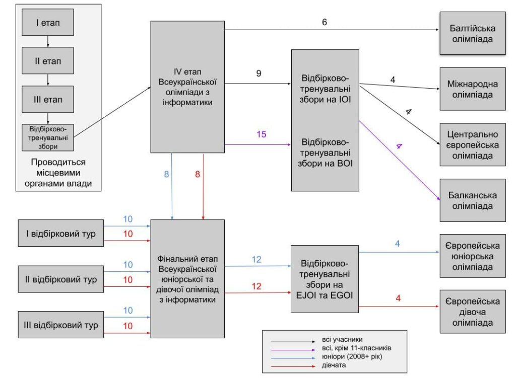 Ми проводимо Всеукраїнську юніорську олімпіаду з інформатики (для тих, хто народився у 2008+ році) та Всеукраїнську дівочу олімпіаду з інформатики (для дівчат, які навчаються у школі). Ці дві Всеукраїнські олімпіади відбудуться одночасно на одному наборі задач, але з різними рейтинговими таблицями. Кожна олімпіада складається з двох етапів: відбіркового та фінального.